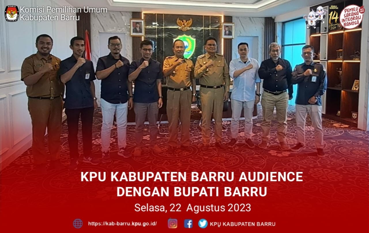 #TemanPemilih, Selasa,22 Agustus 2023 ,KPU Kabupaten Barru.Melakukan audience Ke Bupati Barru , dalam rangka menjaga hubungan baik dengan Forum Komunikasi Pimpinan Daerah , Selain silaturahmi, pertemuan ini juga sebagai perkenalan Anggota KPU Kabupaten Barru Periode 2023 - 2028 dan perkenalan dengan Sekretaris KPU Kabupaten Barru yang baru di lantik. Kegiatan silaturahmi tersebut dihadiri oleh Bupati Barru yang di dampingi Kepala Kesbangpol KabupatenBarru dan Kabid poldasri Kesbangpol Kabupaten Barru. sedangkan dari KPU Kabupaten Barru hadir Ketua KPU Kabupaten Barru Abdul Syafah.B.S.Kom,Divisi Sosdiklih, parmas dan SDM Ir. H. Abdul Mannan.M.Si.,MH, Divisi Teknis Penyelenggaraan Busman A. Gani.SH, Divisi Perencanaan, Data & Informasi Arham. S. Sos.,MM, Divisi Hukum & Pengawasan Ilham.SH, Sekretaris KPU Kabupaten Barru Andi Anwar Musaddad Thahir. S. Kom, Kasubag Keu,Umum dan Logistik Rosmiati S.Pd.,M.M, serta Kasubag Teknis dan Parmas Mustan Afandhi Hafid SH.,MH . Maksud Audience ini adalah menyampaikan Tahapan Pemilu Serentak Tahun 2024. Bupati Barru menegaskan bahwa seluruh jajarannya siap membantu KPU Kabupaten Barru dalam Penyelenggaraan Pemilu serentak tahun 2024.