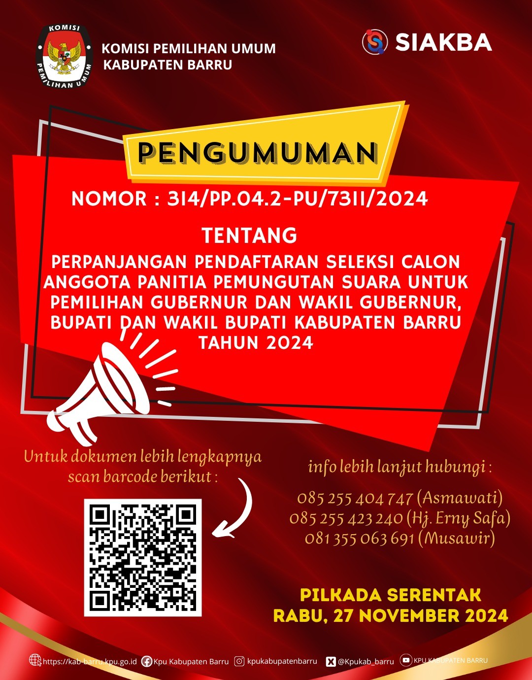 PENGUMUMAN TENTANG PENYERAHAN SYARAT DUKUNGAN BAKAL PASANGAN CALON PERSEORANGAN DALAM PEMILIHAN BUPATI DAN WAKIL BUPATI KABUPATEN BARRU TAHUN 2024 Minggu, 05 Mei 2024 09:00 720 unduh formulir Baca Selengkapnya