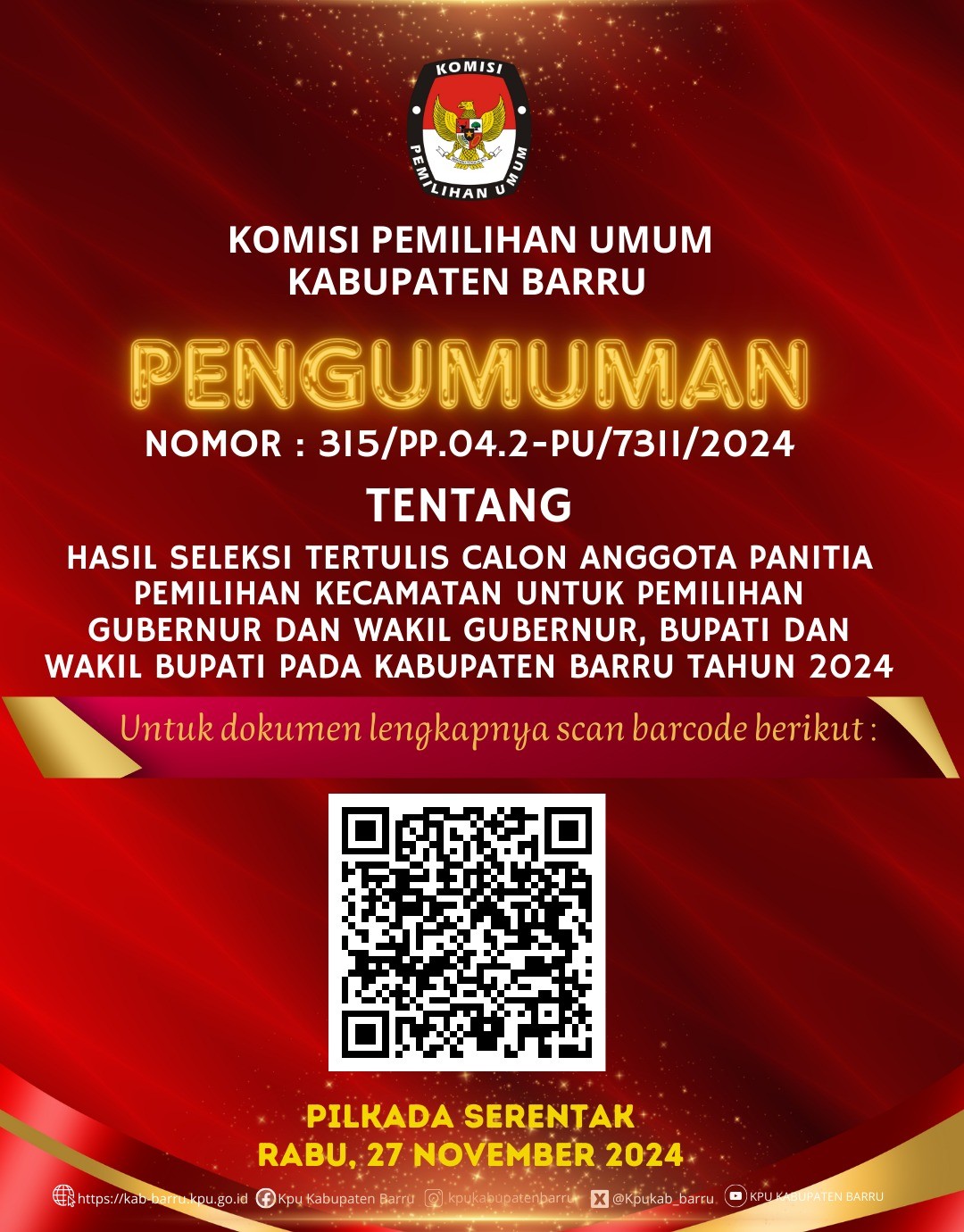 PENGUMUMAN HASIL SELEKSI TERTULIS CALON ANGGOTA PPK UNUK PILKADA TAHUN 2024 Kamis, 09 Mei 2024 13:00 716 UNDUH FILE PENGUMUMAN Baca Selengkapnya