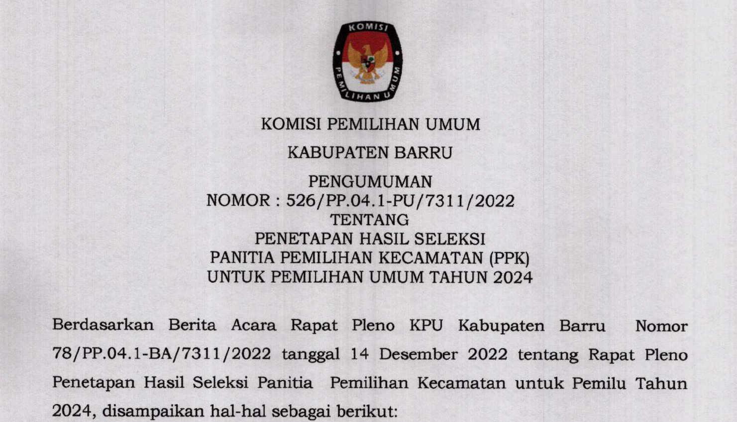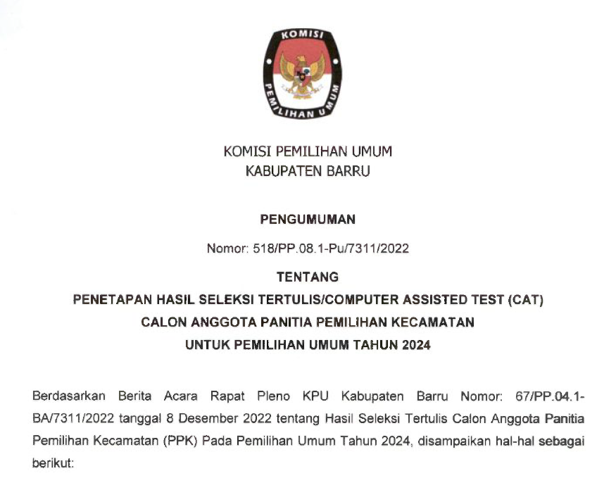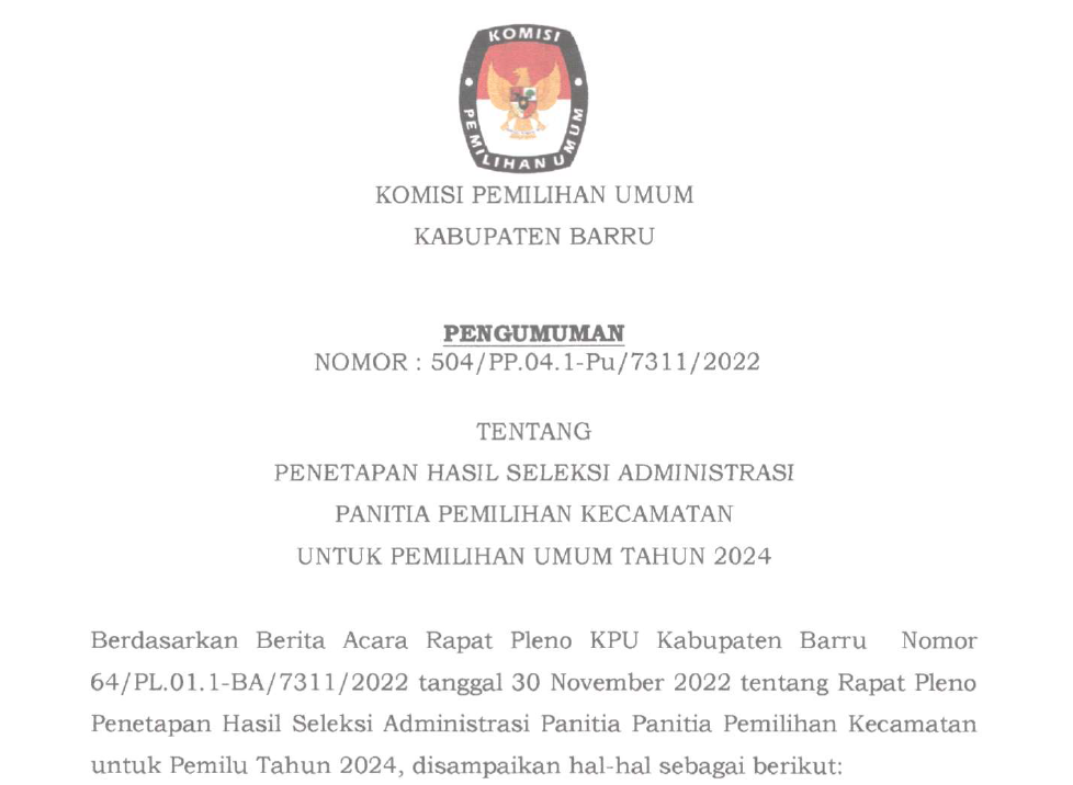 Berdasarkan pada Berita Acara Komisi Pemilihan Umum Barru Nomor : 64/PL.01.3-BA/7311/2022 tentang Rancangan Penataan Daerah Pemilihan dan Alokasi Kursi Anggota Dewan Perwakilan Rakyat Daerah Kabupaten/Kota dalam Pemilihan Umum Tahun 2024, dengan ini mengumumkan Rancangan Penataan Daerah Pemilihan dan Alokasi Kursi Anggota Dewan Perwakilan Rakyat Daerah Barru dalam Pemilihan Umum Tahun 2024 untuk dapat mendapatkan tanggapan dan masukan masyarakat .